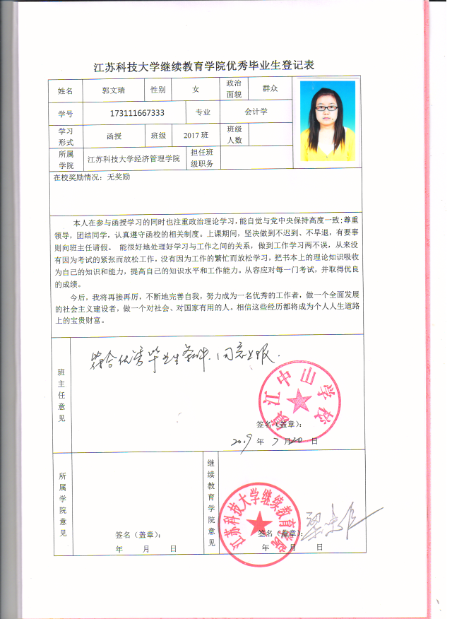 郭文瑞-2017年被江苏科技大学经济管理学院会计学专业录取,在学习期间尊重领导、团结同学,上课从不迟到早退,较好的处理学习与工作之间的关系,从来没有因为考试的紧张而放松工作,也没有因为工作的繁忙而放松学习,将书本上学到的理论知识消化吸收,从而提升自己的工作能力,各科成绩优良!2019年被江苏科技大学评为优秀毕业生!